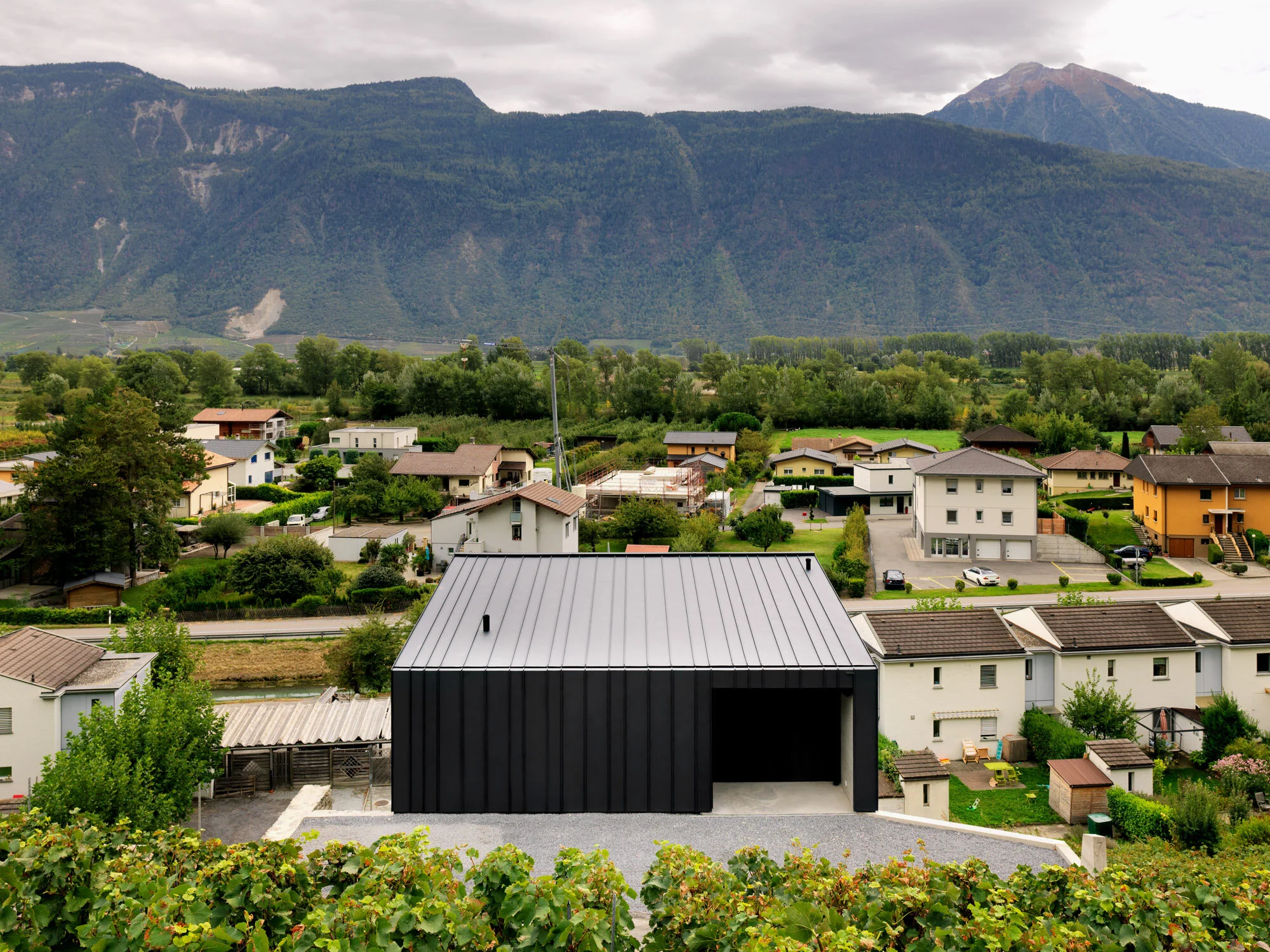 Le projet qui se veut monolithique s’implante dans une forte pente du vieux village de Branson à Fully. Un plaquage métallique emballe le volume qui est maintenu par deux joues de revêtement à la chaux. A l’intérieur la matérialité est brute, composée de béton et de mélèze. L’organisation des locaux se développe en demi-niveaux afin de suivre la pente du terrain et d’offrir un jeu de différentes hauteurs selon les fonctions.